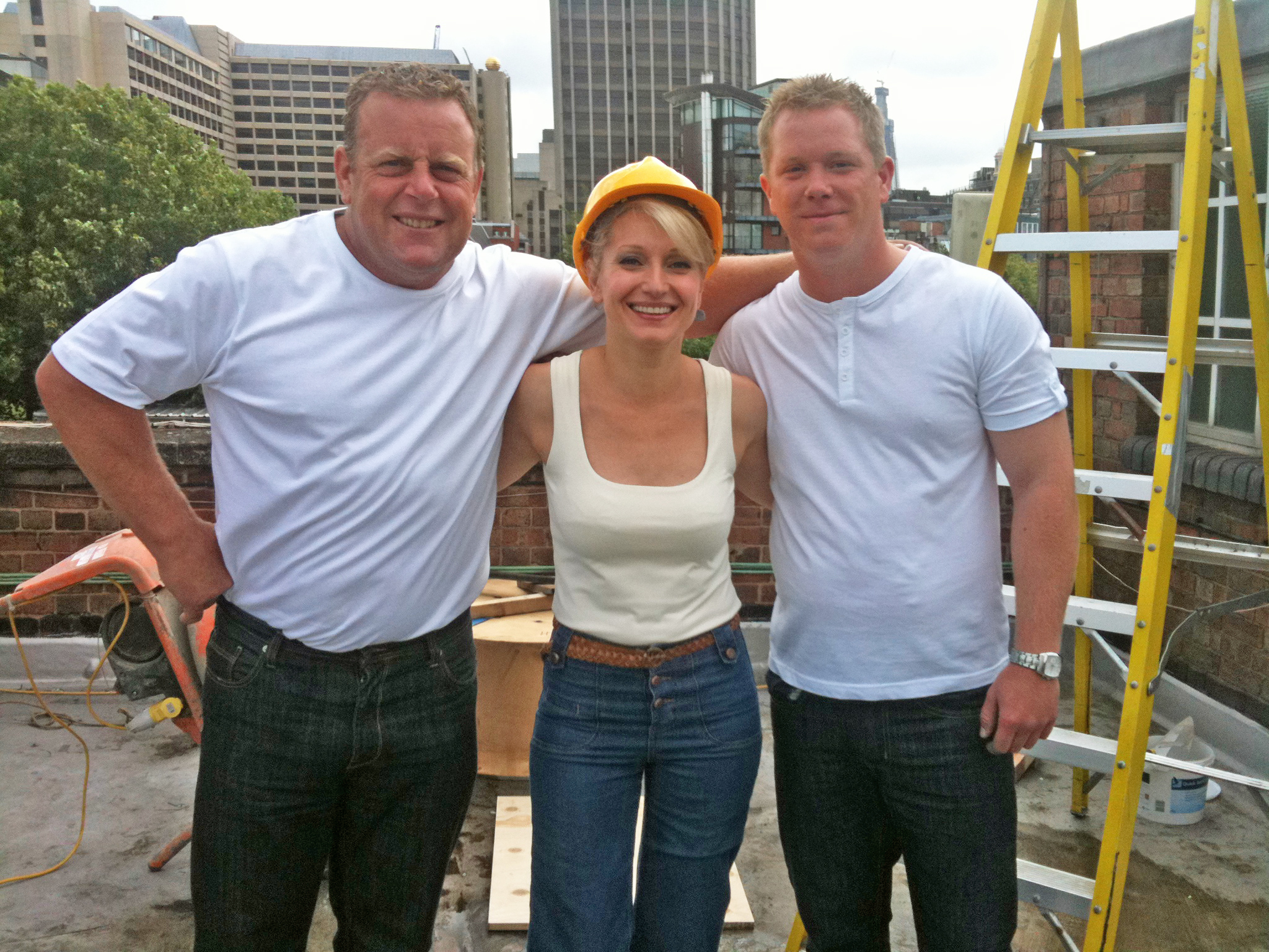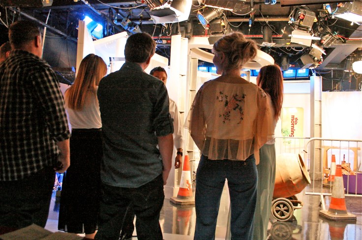 Before we were on the show live, the three other builders – Russ, Billy and Gary (the latter of whom had turned up still half-cut from the night before, builders eh?!) and I had to go up to the This Morning roof for some comfort tests. ‘Please climb those ladders very slowly whilst wiggling your bum’ is not a request I’ve had before, nor am I a proficient bricklayer, as the eventual footage showed, ahem. Bit better than Gary though, at least mine were straight!