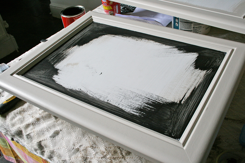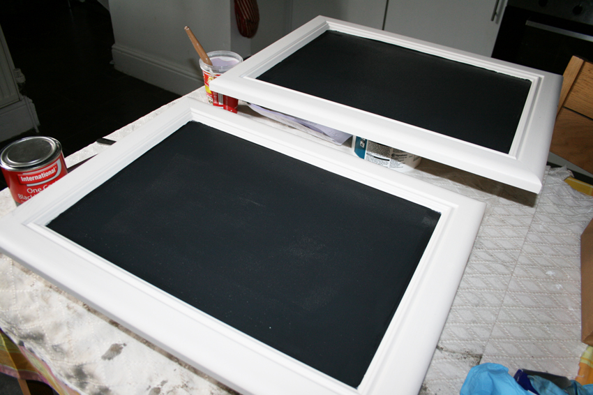 Although the paint can be one coat on a dark surface, I used three to get a good solid colour on white undercoat, using a brush to do the edges then a narrow sponge roller for the middle. It’s all water based so even though it’s black, you can clean off brushes etc easily (though do use an undercloth as it will stain pale surfaces!)