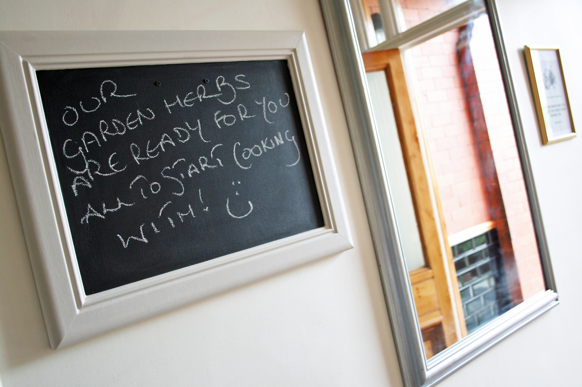 We screwed through the original handle holes using black screws to fit the blackboards to the walls and voila, cheap, cheerful and changeable new noticeboards on all the communal hallways, where we can let tenants know about local events or even what’s growing in the Moregeous garden!