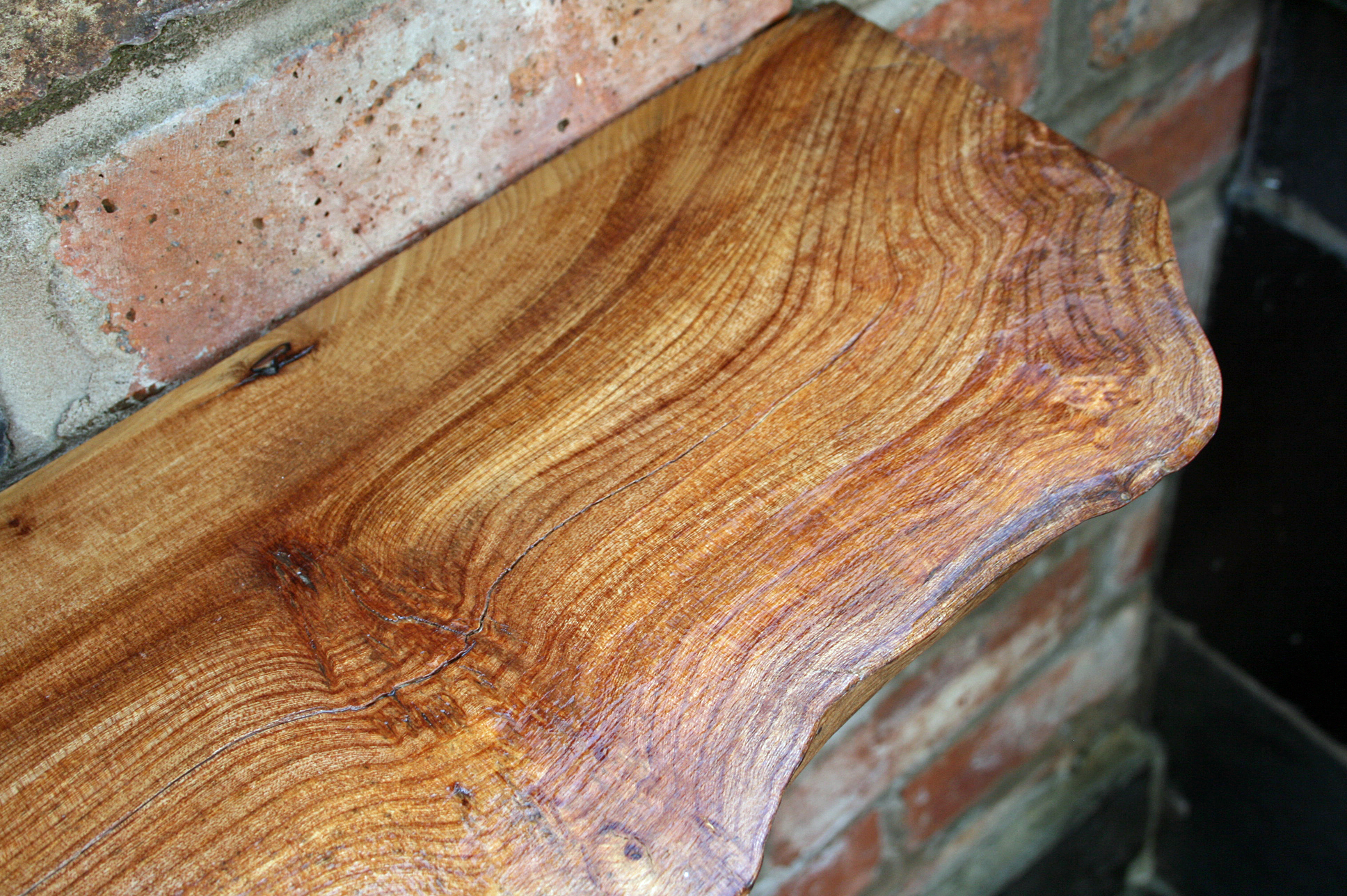 When we moved into our wreck of a home, it had been rented out and not touched since the 80’s. It had a curious bed deck construction that had been cobbled together from a zillion different offcuts of timber, most of which couldn’t be re-used, but when we dismantled it, there were a few interesting looking slices which I saved for a rainy day – five years later! This piece below was filthy and roughly varnished so I stripped and sanded it back to use as a shelf on the tenants roof terrace we’ve been working on.