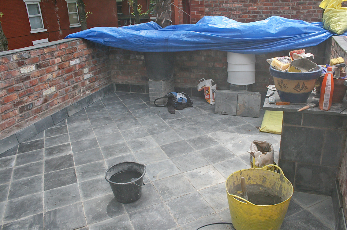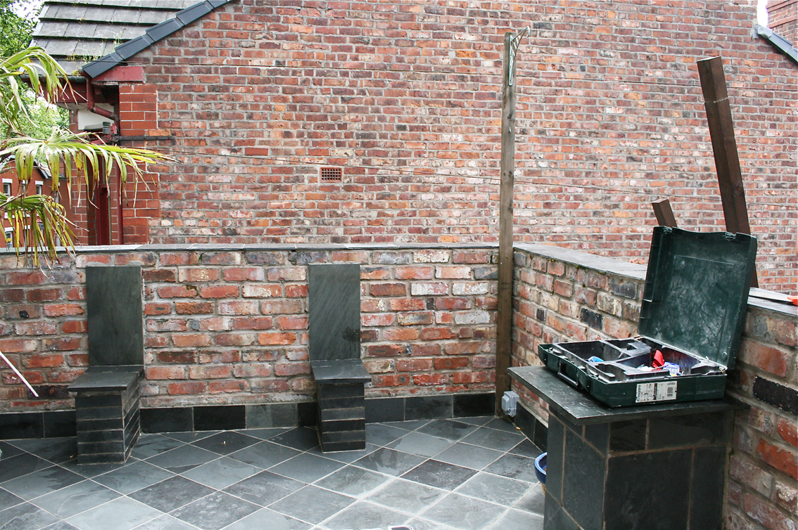 It was retiled using most of the original slate plus a few extra and the old tiled bench top removed. That bloody tarpaulin was up and down like a tart’s you know what’s in the persistent summer rain!
