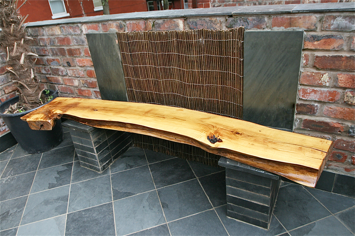 Slightly more yellow and bendy than I’d originally anticipated she’d look once positioned, but you gotta love her for sheer quirkiness! Our salvaged piece of Robinia timber was sanded down using a belt sander and fixed in place using some heavyweight screws on the original two slate end posts. I hate the striped slate which runs horizontally on the legs of the bench so we’re going to tile over them with a couple of solid slate tiles but that’s next week’s job.