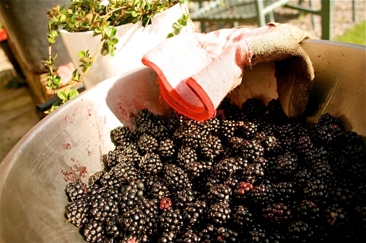 Nearing the end of July and already enough blackberries to stuff a gigantic crumble, total result! One of the bonuses of living in student land is having a super-grown over garden next door – it’s a jungle paradise for Missy and at the moment a fruity paradise for me. The students have all gone home for the summer, leaving us a bumper harvest of juicy fruit which the warm Spring has ripened earlier than the normal late summer expects. My plan was to tend to my summer garden then relax in it at the end of the day. We planted five bay trees taken from one of the rentals, where the aphid poo dropping down on them from a great lime tree height was wrecking their leaves. Then we planted two trees which I’d left in the pots for far too long, plus my pineapple guava (Acca Sellowiana) which has started to flower, though she’ll probably never fruit – it’s too cold as she hails from South America. Hers is a wonderfully exotic minature bloom which flowers all over the small tree: