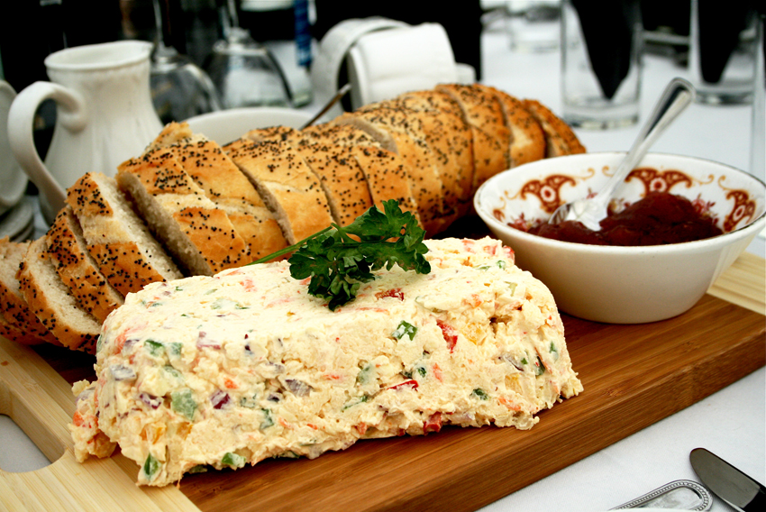 Lunch was yummy, with lots of fizz and a crunchily fresh peppery cheese loaf. Our table had ten people on it and one loaf, the next table just two people and one loaf – bad table decision on our part!