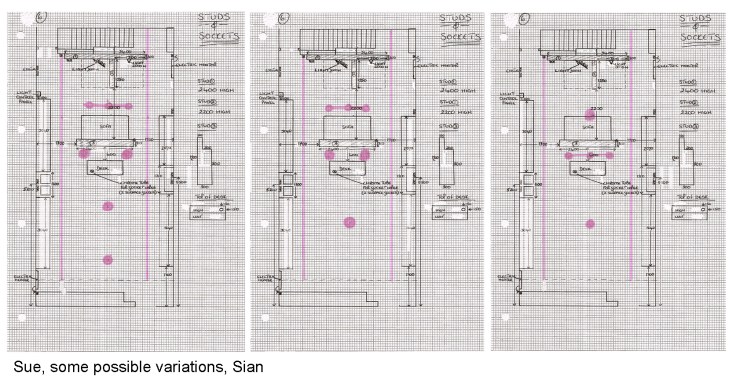 Not being a CAD girl, I drew up some plans for the layout, working with Sue and where she wanted the units so I could plan the moving of sockets / lighting etc. Because the walnut units fitted flush to the walls, all the existing trunking was in the way & sockets had to be moved and fitted in exactly the right places. Drawing up the space also allowed us to plan exactly where the changing rooms would go, the sofa, the new stud wall behind the desk and the desk itself, along with all the necessary distances between them. It’s surprising how many times people underestimate the amount of space required and find they have run out of room halfway through a building job if the proper planning wasn’t done at the beginning. This was vital as we needed access through the changing room stud for the original fusebox & had to drop wires from the ceiling down in the middle of the room through a chrome pipe for desk sockets & telephone connections because the laminate floor was being retained so no wiring could be done under the floor.