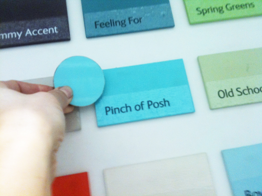 The main shop walls were emulsioned in B&Q Lauren and the changing room walls were to be in the same blue as the Modiste signs. After a good rummage around testers, paint cards and sample sheets with the Modiste ‘dot’ below, the best and most vibrant was Laurence Llewelyn-Bowen’s Pinch of Posh, from his Graham & Brown range, also at B&Q.