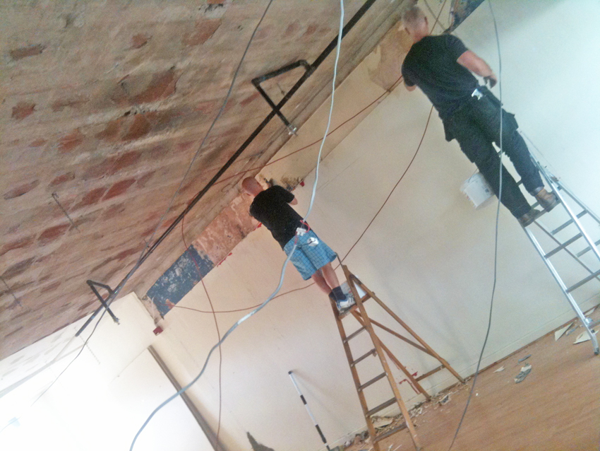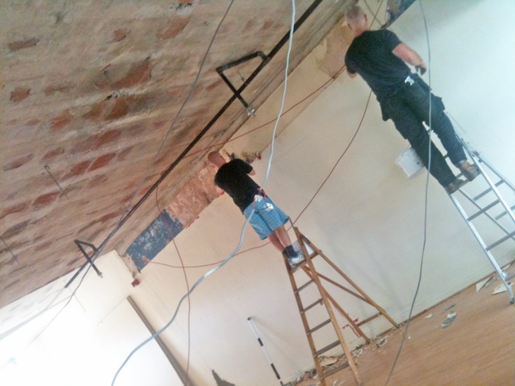 Our work began two weeks ago and down came the ceiling along with a spaghetti junction of wires, perfect to give the electrician a where-the-buggary-does-that-wire-come-from headache.
