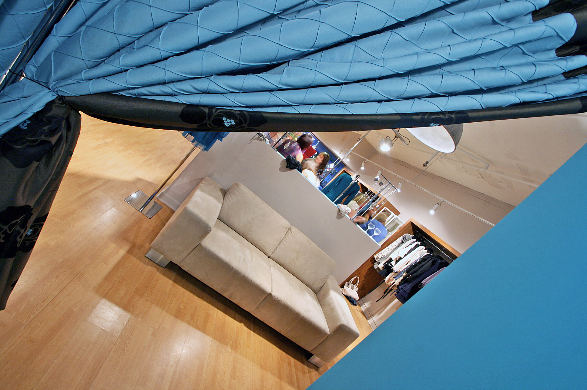 The original three spot fitting was re-used above the till area and a vertical chrome pipe cleverly hid the cabling needed for the sockets in the centrally positioned desk. You can see the chrome pipe below, just cutting that lady in half. The extra width wall we built between sofa and desk worked well with it’s split level, allowing Modiste to utilise the mini-shelf for display or practical storage. There are to be walnut shelves made to sit on the two long tops to tie in with the walnut clothes hanging units. It’s important when building a low stud wall in the middle of a room like this for it to have the stability not to wobble if anyone leans on it, this one is 400mm wide, any narrower may be a problem.