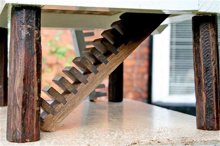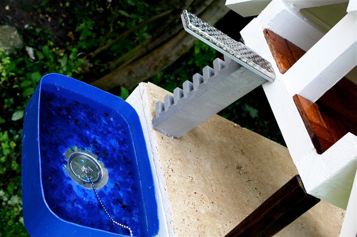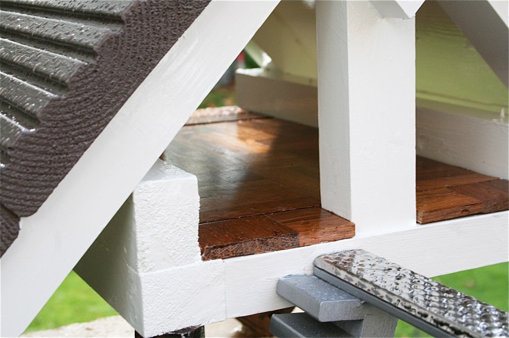 As you can see the only bits left from the old house are the four vertical posts which have been sanded down and re-used as the corner posts. A large slab tile of travertine has been fixed onto the timber base, with a high pitched roof allowing a parquet floored mezzanine level for the little birds (no pigeons allowed!). Most of the timber has been painted in vanilla white gloss, with walnut stain to the internal staircase and posts. The decking roof has been painted with Farrow & Ball London Clay and the swimming pool fashioned from an old plastic base primed with ESP and painted royal blue. We made the staircases out of some old Ikea cd racks with the stairs to the swimming pool diving board sprayed with chrome spray and the diving board made from a stainless steel ridged tile. The pool even has it’s own plug!