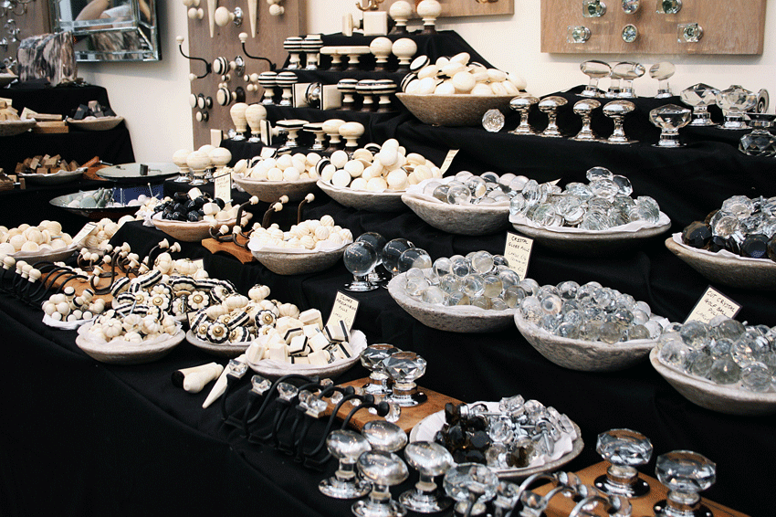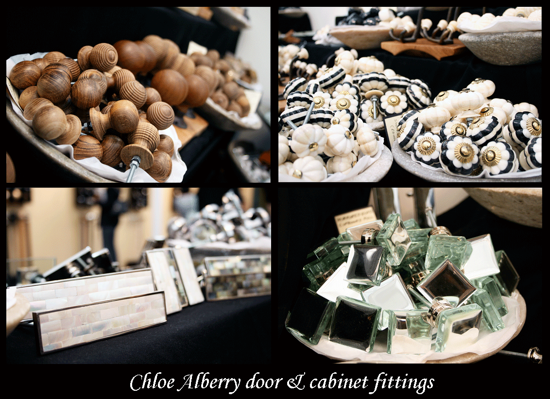 I loved the Chloe Alberry stand display at Decorex 2011, a veritable sweet shop for the interior design lover with baskets and baskets of goodies lined up for us to delve into. Door and cabinet fittings made of glass, mirror, timber, chrome, porcelain, mother of pearl and even cricket balls! Something for everyone and all at really reasonable prices I thought. Great for if you’re upcycling a piece of old furniture from an auction or second hand shop, or giving a touch of individuality to an Ikea bought chest of drawers or wardrobe 🙂