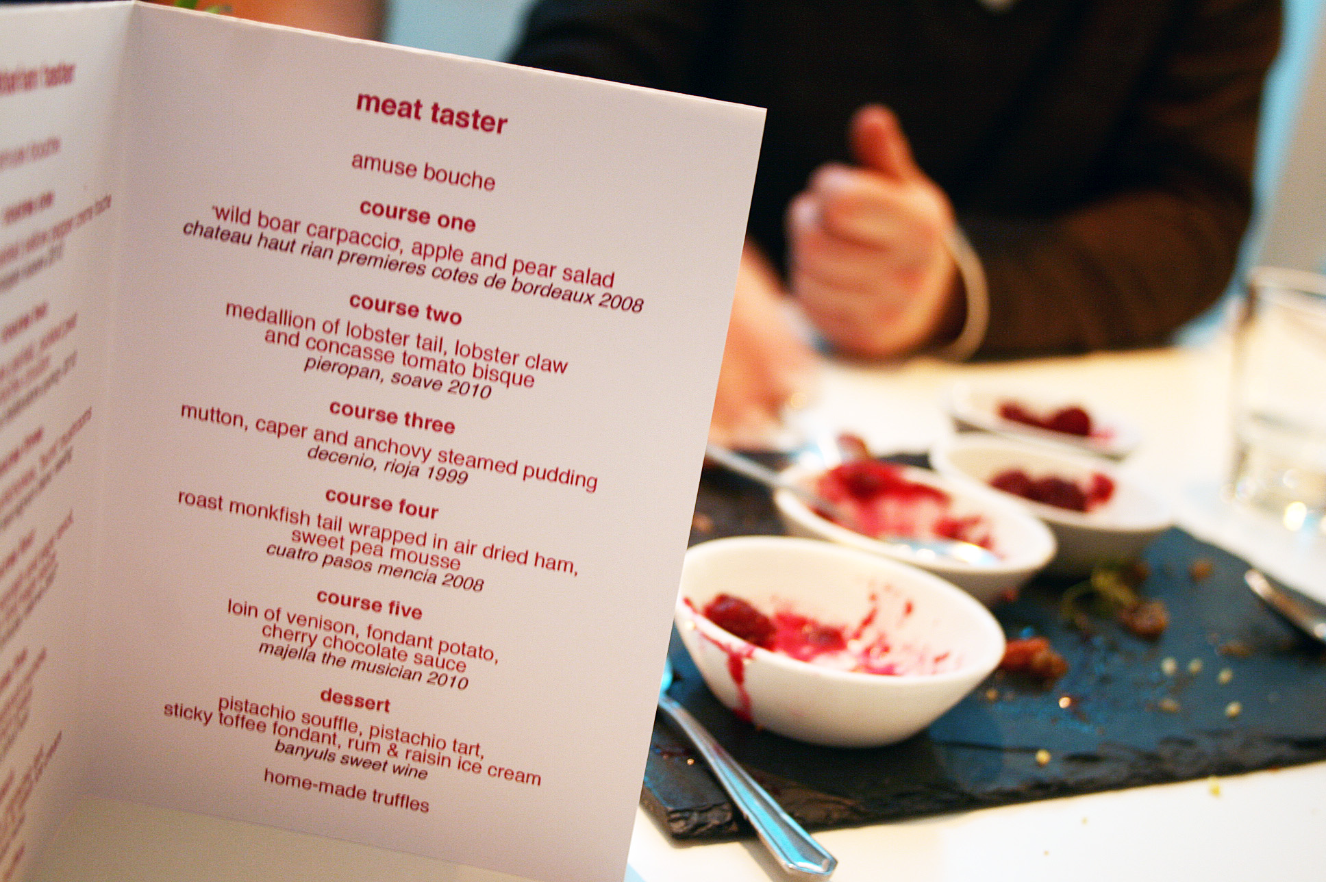 I can’t even pick a favourite from the above three courses, they were all so different but stunning in their own way. The mutton pudding was an absolute hit on our table of four, packed full of a deep, rich, solid meatiness you just don’t get with lamb. The pea mousse was light and delicate, complimenting the seared roast softness of a piece of monkfish tail full of succulence. Then the venison, heavens above, flawlessly pink & tender with a cherry chocolate drizzle. The stuff of dreams.