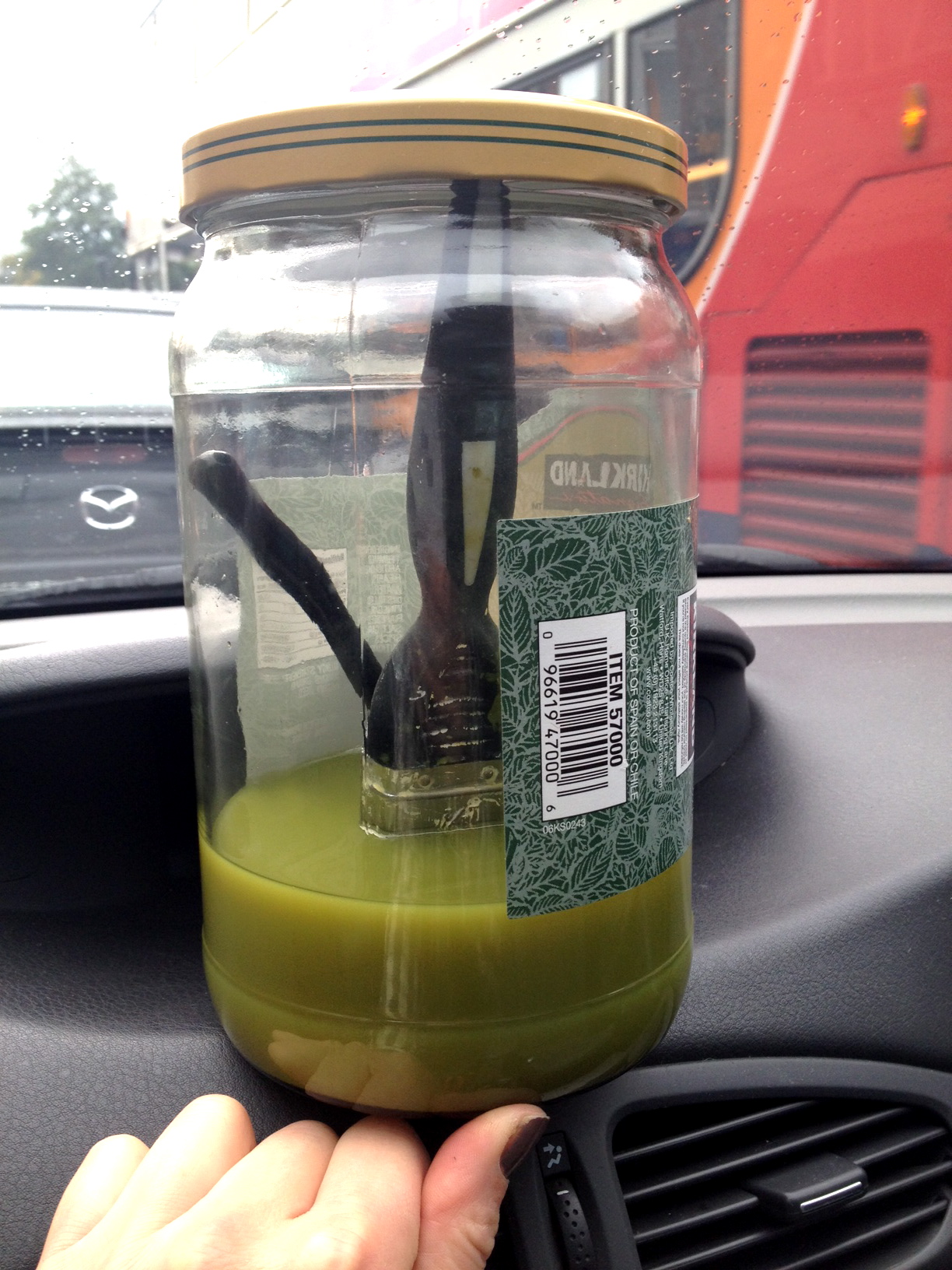 You can buy all the designated brush cleaning apparatus in the world but there’s nothing better than recyling /re-using your own. Costco’s giant jar of artichokes has made us some delicious late night dips over the summer – now to make use of the empty jar too, a complete success with no spillage! Filling it with turps at 30mph got me shouted at by Mr M though 😉