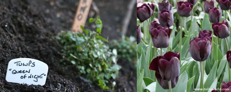 Apparently they should start to sprout through in around March and, dependent on the type, be ready for pulling up June to July. Bit gutted I have to cut off the flowers to encourage bigger garlic bulbs to develop so I planted lots of sexy black tulips too 🙂