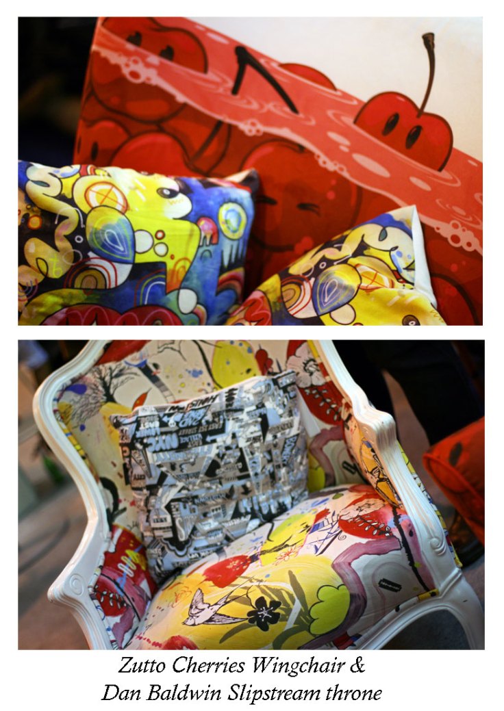 Fabulously elegant yet cartoonish fabrics clad elegant seating shapes in the centre of the Design Village. The Zutto Cherries sofa was even graced by George Clarke’s bum for an interview at one stage 🙂