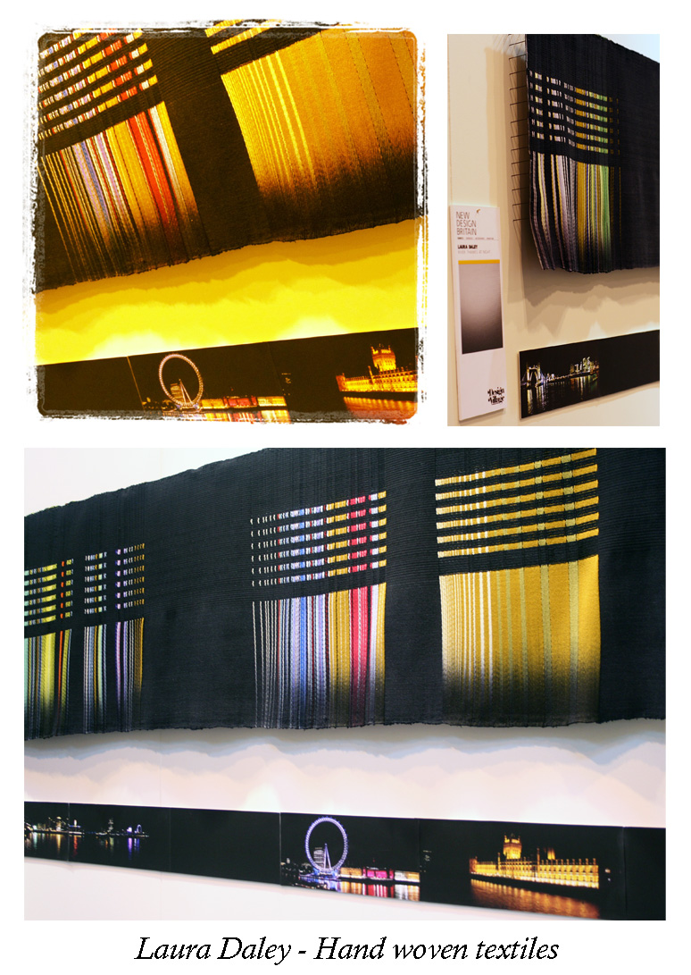 Laura Daley skilfully captured the glowing lights reflected in the River Thames with her dip-dyed fabric, the elongated multi-coloured essence of London at night. Her unusual work won the New Designers British Contract Furnishing Association (BCFA) Award – congrats Laura!