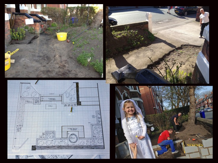 Little wonder I fell fast asleep on the sofa for an hour this afternoon, what a week!! Glorious weather meant we were inspired to start the last of the tenants’ gardens, a dullsville space with two overgrown weed beds and a very tatty path. I drew up a plan of how I wanted it to look, with lots of seating to get people out of the flats and into the fresh air, but the tree and her extensive roots had other ideas. The top left area is mostly the same but the bottom right seating round the tree has now been somewhat amended. It’s so important to make outside spaces for rental accommodation engaging and usable, not only for the inhabitants but for the neighbours to see – it should be obligatory! We even had a visit from a nearby princess, always good for local royalty to approve of plans 😉
