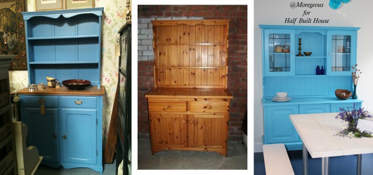 And another extra!! I wanted to create an exciting pop of colour in the dining area, something which really combined country style with a more contemporary feel. I had in mind to paint a dresser of some description and this idea became a mission when I saw the blue one below at a local antique fair. At nearly £500 it was out of my budget, so it was onto Gum Tree we went…. £65… complete bargain!! Poor Nick & Mr M had to set off at 6am to Glasgow to get it however, I wasn’t their favourite person that day (but hey, this is Half Built House, am I ever?!)