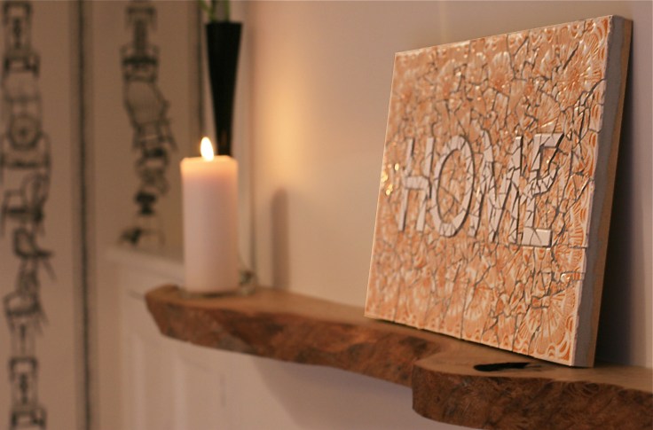The boys were in the middle of removing the kitchen units on the first day in our Exeter Half Built House when behind the old kitchen sink we found some old white and amber patterned cracked tiles. Whilst far from perfect for use in the scheme itself and also covered in filth and grout, I had a little idea of where they might come in useful….
