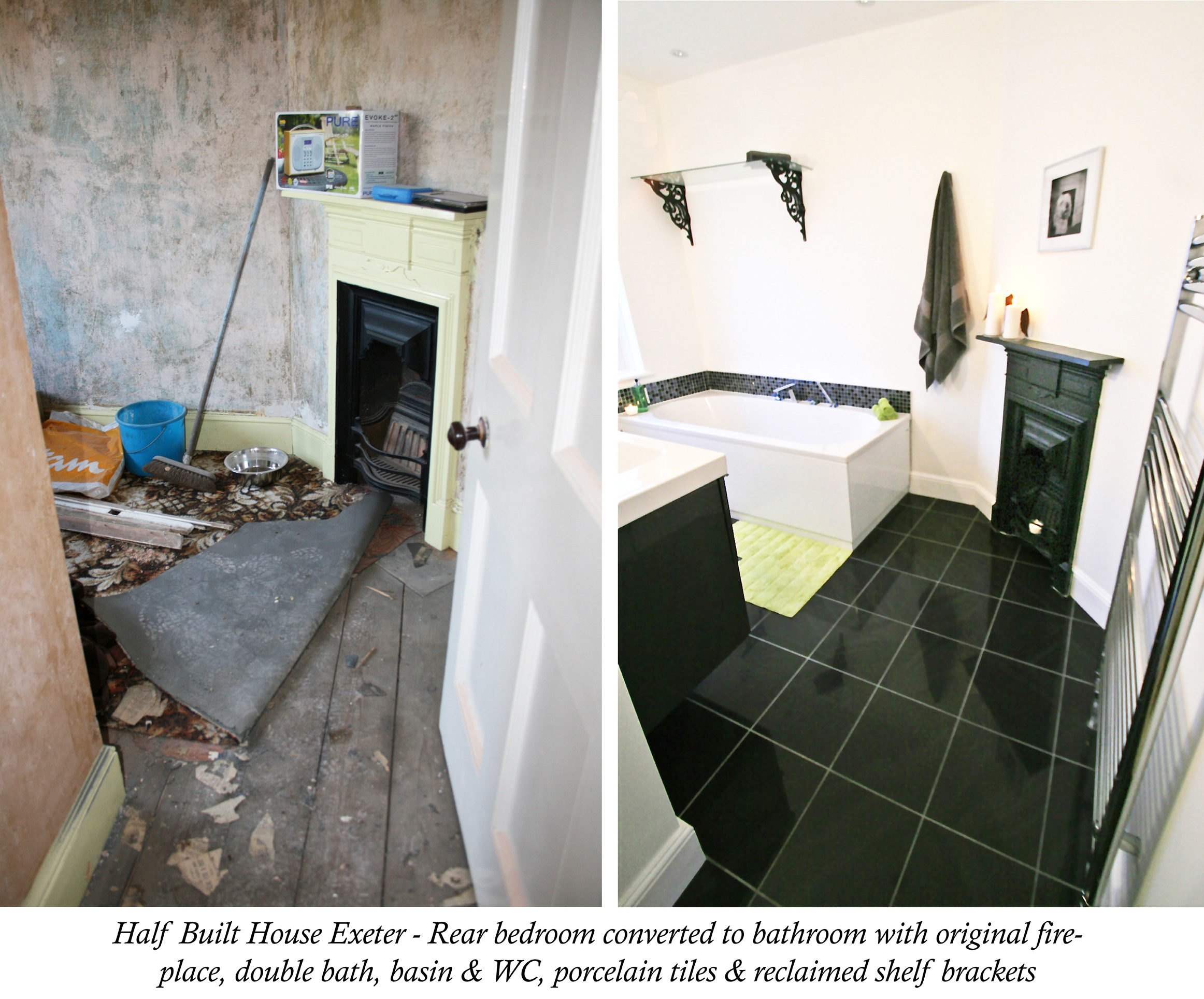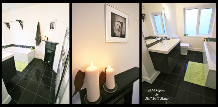 My somewhat solitary decision to turn firstly the existing bathroom into a shower room off the master bedroom and secondly the fourth bedroom into a bathroom for Amie meant moving walls, extra plastering, more plumbing and more tiling, but I absolutely think it was the best thing for the house and our couple. Chris got his super sized shower and Amie a place of sanctuary after months of upheaval. I wanted to keep to a fairly neutral palette of black, white and greys to the first floor, so the couple could add their own colours and personality later. In the bathroom the gorgeous once yellow fireplace surround was thoroughly cleaned down and then sprayed black, a very glamorous feature for some angel winged bathroom candles. The brilliantly affordable Topps Tiles black gloss tiles to the main bathroom gave a reflective and glam feel to the floor.