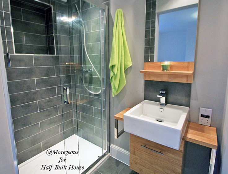When you’re designing an en-suite it’s all about the detail as most en-suites aren’t exactly huge! We simply did not have the room for a loo but as there was one in the main bathroom and one downstairs this didn’t exactly matter. All the more room for a marine-sized shower and a basin with storage 🙂 The rather sexy AND British made Infinity shower tray gave a large enough space for two and the elegant sliding door was sleek and smooth. A touch of warmth was added with oak shelved basin unit from TC Bathrooms. The linear grey wall tiles from Topps linked in with the linear design to the ground floor #attentiontodetail