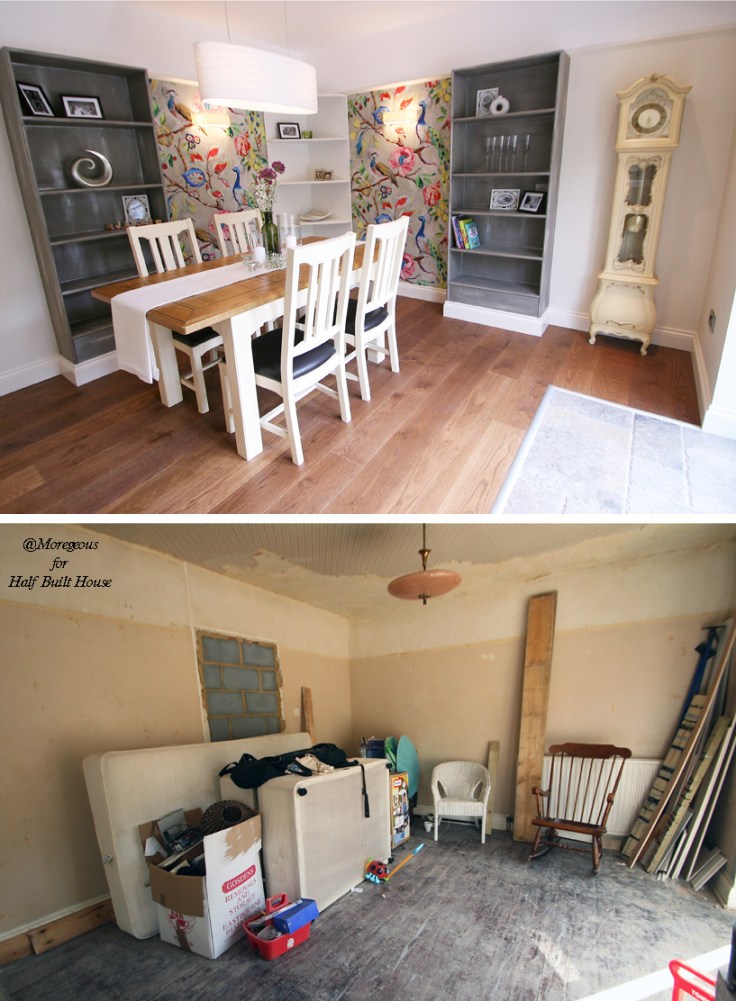 I wouldn’t have dreamt of installing a bright pink kitchen just for shock value, but felt that my interior design scheme for such a young couple could take a serious injection of colour. However I didn’t want a simple feature wall. As the room began to take shape and the bookshelves were marked in place, two areas stood out as ones which could be enlivened.