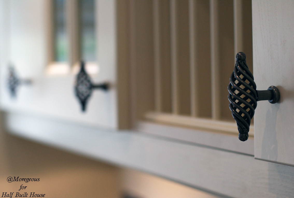 I chose dark metal cage handles rather than chrome or silver to pick up the other black design elements in the room, one of which is the granite work surface in is a slightly sparkling shade called Nero Stella. Interestingly this granite is wrapped around a template which can be useful in a kitchen where the weight of the worktop is an issue or where existing tops have to be worked with. The sharp edges and slimline depth gives the kitchen a more contemporary feel and the wider granite in front of the range allows for a mid-room breakfast bar area. Everything was measured to perfection so as not to overhang the radiator and lose heat yet leave enough room for plates and to stop small hands reaching the range. The sockets were specified in brushed chrome with dark inserts  to keep the black detail theme consistent.