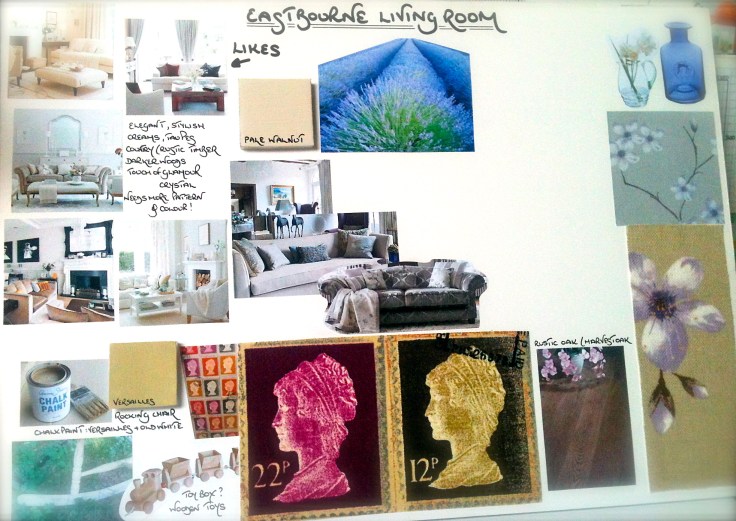 I chose an accent colour of purple for the front room and played with different muted tones to keep the look elegant and sophisticated. Once we’d fitted the new picture rail, the newly skimmed walls were painted in Dulux Pale Walnut, a taupe shade with a gentle lavender hue in certain light, fitting in perfectly with the French theme and my half finished (!) mood board.