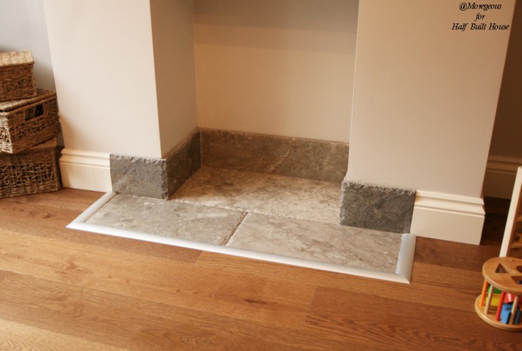 The warm tones of the harvest oak flooring ensured practicality and a more ‘country’ feel than contemporary timbers, Chris & Kyle from Clic-It Flooring did a great job of the fit. Dominic tiled beautifully in the fireplace with the Java Grey marble tiles and we used tiling instead of wooden skirting around this area as it had been mentioned that there may be a wood burning stove fitted in the future.