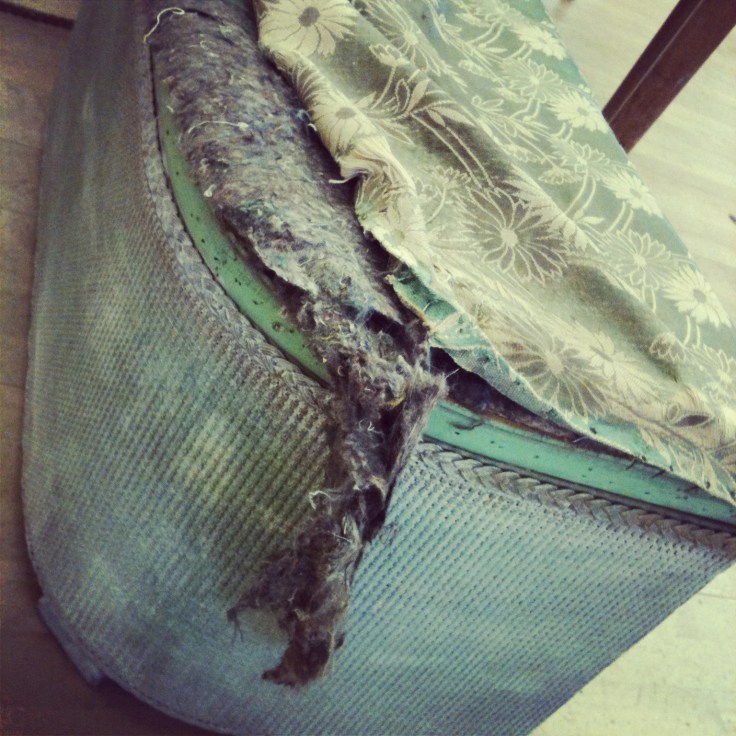 As usual the glamour didn’t last long and it was right back down to muckiness the next day as I dug around in our basement for a piece of furniture to work some magic on. I’ve always avoided anything to do with upholstery as it’s such a specialist thing to do but my appetite was whetted during filming HBH when I’d no choice but to up-cycle and re-cover four dining room chairs, then also had the pleasure of watching expert Glynn Smallwood create a magnificent headboard and sofa. When I found out in August that there was a basic upholstery course starting literally five minutes from my house, my cheque was in the post before the ink dried 🙂