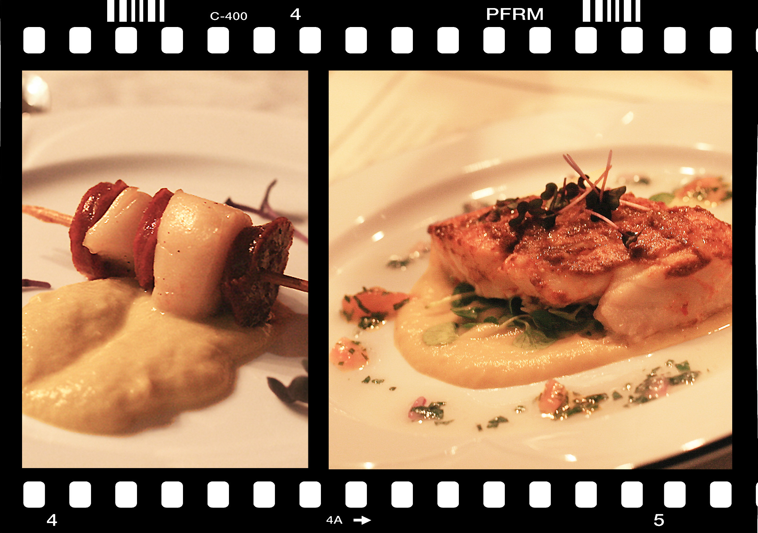 Next up was a king scallop & chorizo skewer on fennel purée – on the left of the image below. Bloody delicious. Perfectly cooked scallops with a delicate but full of flavour fennel purée. I’d have maybe sliced the chorizo slightly thinner as it was a buggar to cut gracefully but in terms of taste, a cracker of a dish served with a Ruinart Rosé.