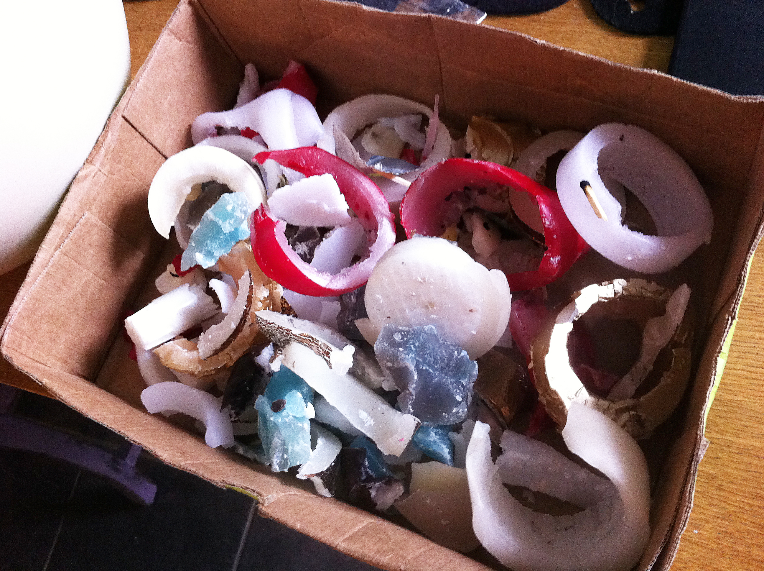To get the maximum amount of heat from our hearth candles, I keep them trimmed down and cut the tops off with a knife whilst the candle is burning and the wax is soft. Over the winter, I’ve saved all the wax scraps and burned down remains in a box, seriously, this below is just a fraction of them 🙂