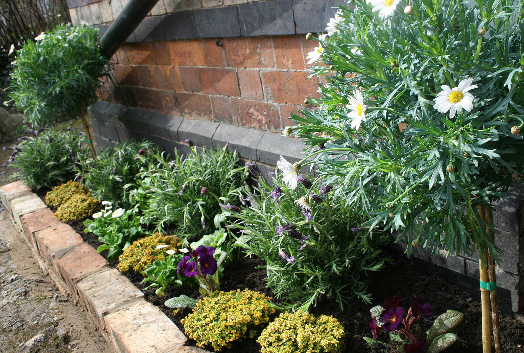 It’s been just lovely this week to have some Easter sunshine to get bulb burying & planting kick-started. We STILL haven’t got round to renovating our ‘eventual’ house and it takes my mind off the interior by concentrating on at least some nice exterior areas to look at! All of the outside path needs replacing but there’s no point doing it ’til inside is done – Catch22 – however inspired by the beautiful show gardens at the Ideal Home Show the other week, I got a bee in my bonnet about a raised bed on the entrance path….. cue Mr M being roped in on a sunny Saturday to dig me a trench and build me a wall whilst I cleared another bit of the garden. He knows how to keep a girl happy 😉