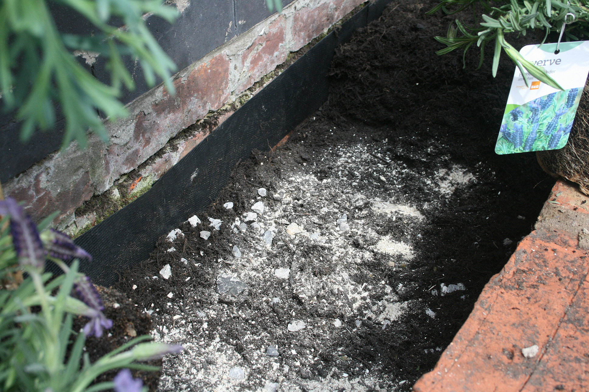 Here below you can see the membrane more clearly. I didn’t bother fixing it to the wall as the soil holds it in place. As I was planting lavender and thyme, both of which adore & need good drainage, I used gravel as a base under the peat free soil to stop the roots getting water-logged. I was so sick of losing thyme plants that I did this last year in one of the communal rental gardens and just sat some thyme on two inches of gravel, then soil around. It grew all through the winter & is still flourishing #toptip. Fingers crossed it works in my garden too 🙂