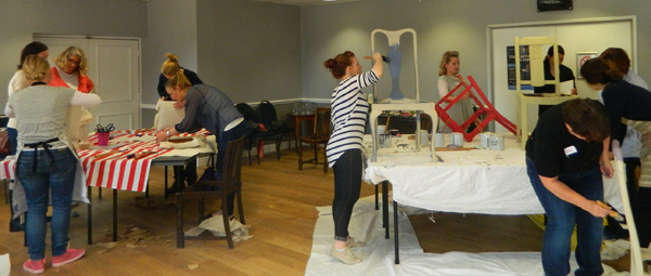 So pleased to report that Saturday’s Masterclass was absolutely brilliant, filled with creative thinking, skilled activities and enthusiastic attendees who were all determined to muck in, get stuck in and take away a fabulous chair. It honestly couldn’t have gone any better, we even had sunshine to dry our chalk paint layers and wax – perfect! Our eight guests were faced with a wall of rather unloved and abandoned chairs, chose their favourite style and got cracking. Four worked on chalk paint techniques with Zoe and four on traditional seat pad upholstery with Andrea, then swapped over after lunch, whilst I effortlessly floated between the two looking serene. That is of course a big fat fib; I dashed around the room helping out, catching drips, teaching hammer holding, taking pics, washing brushes and moving chairs in and out of the sunlight to dry. Boy, was that double chocolate cheesecake needed at afternoon tea time đŸ˜‰