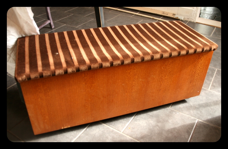 As ever St Anne’s Hospice charity shop came up trumps with an old bedding box for a fiver when I told them it was for a good cause (thanks lads). I scoured the Moregeous Cellar of Shame for old metal brackets & accessories then sprayed them gold, plus found some lengths of pine cladding to create a panelled look and painted the whole lot dark walnut with some woodstain left over from a previous job. Don’t be put off by the colour of timber if you like the shape of something – anything can be painted and transformed!