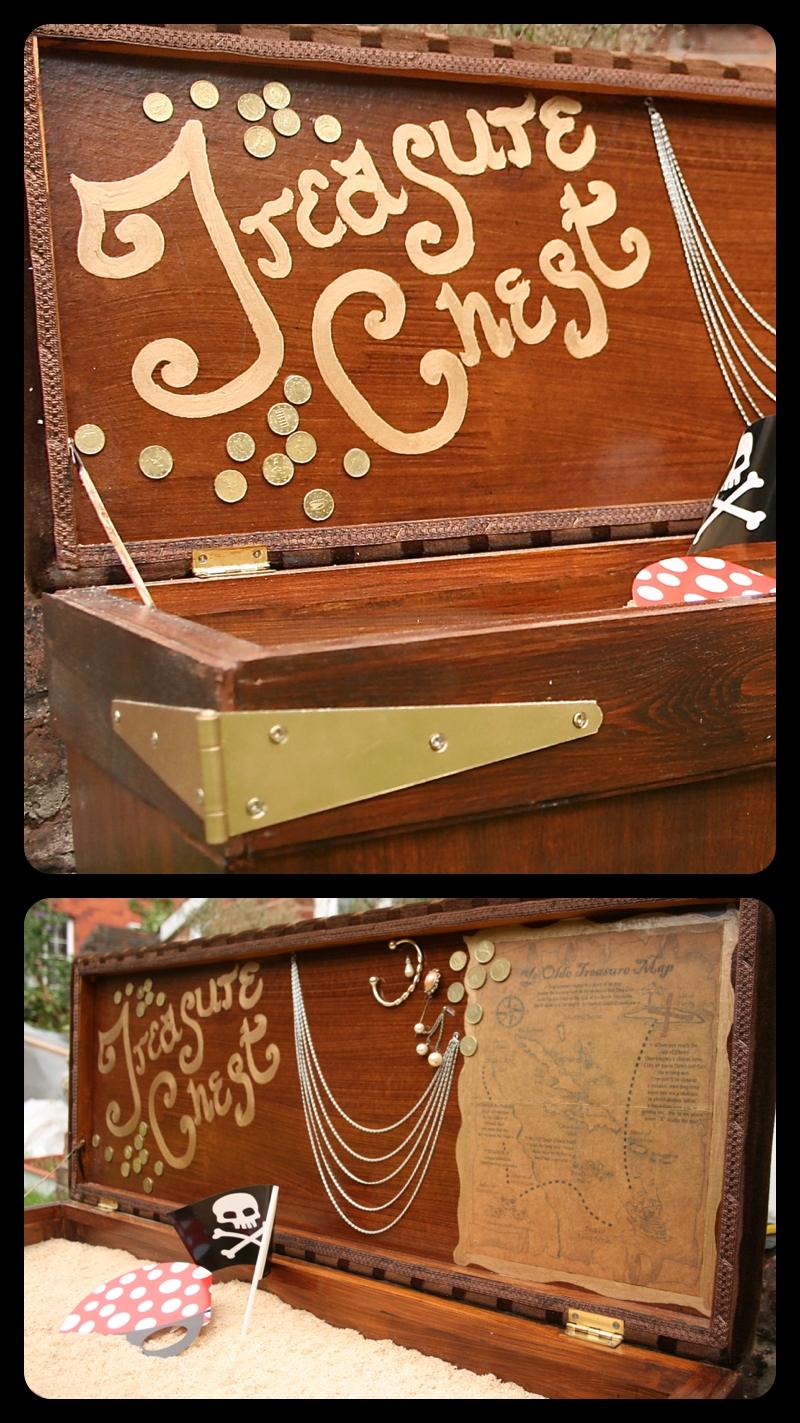 I used gold paint to write the words Treasure Chest and superglued some holiday leftover 10cent Euros coins randomly on the inside of the lid – I BET someone tries to get them off đŸ˜‰ For an added treasury feel, I also superglued some old jewellery on the lid – check charity shops for great gold & fake pearl finds. On Ebay I found a party shop selling treasure maps for 99p and added that too!