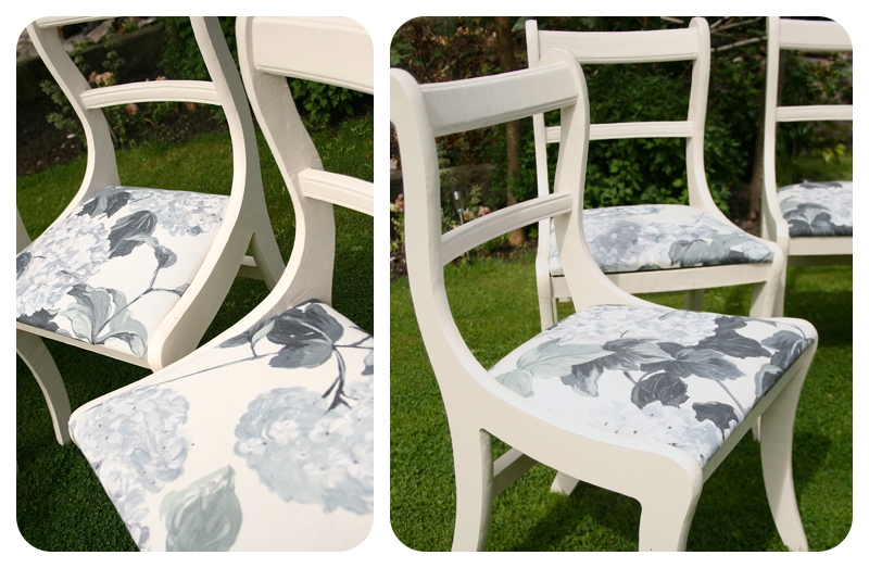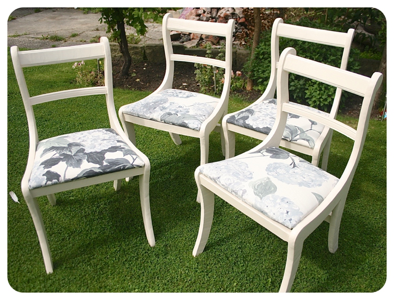 Practising what I preach, we’ve this week been upcycling four lovely chairs for one of the apartments we rent out as the existing ones are a bit rickety. They’ve been repainted in Dulux Candle Cream and the seat pads reupholstered using some gorgeous Designers Guild remnant fabric I was lucky to find on Ebay. Total cost: 1/4 tin of Satinwood (£5), £20 in fabric and some staples instead of what would probably be about £80 each to buy new.