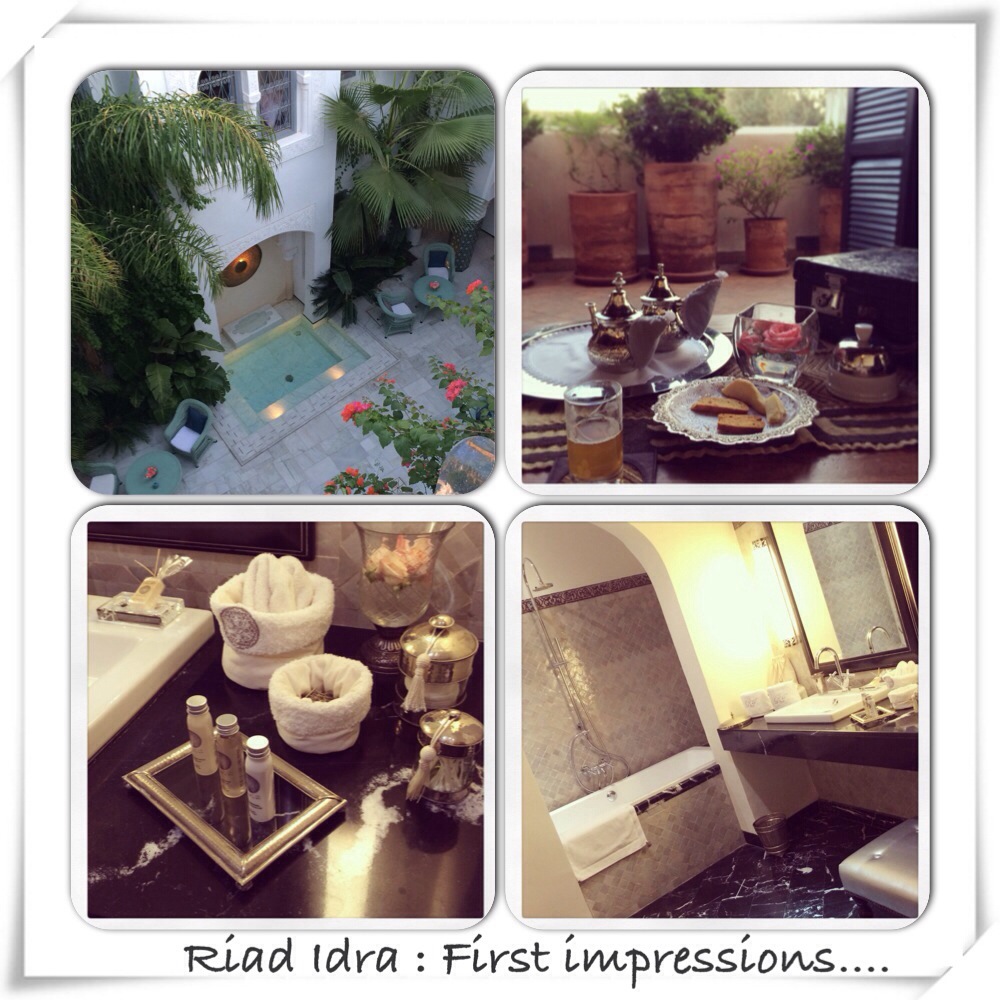 We arrived in Marrakech to a dry, sunny Autumn evening, leaving the soggy leaves and blustery gales of Manchester in October far behind. First impressions of the Riad Idra were just perfect, a cool white marble courtyard bedecked with lush greenery, singing sparrows and fuschia blooms, with sugary mint tea on the rooftop terrace, a time to unwind before we were shown our Amal room. The perfect, gentle introduction to a holiday I thought, already these smaller Moroccan Riads seem so different to many larger hotels we’ve visited, where you’re simply given the plastic key & pointed to the lift.