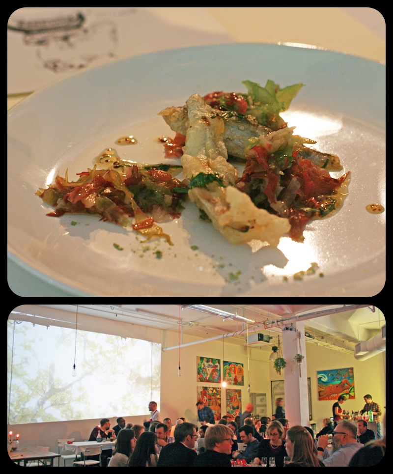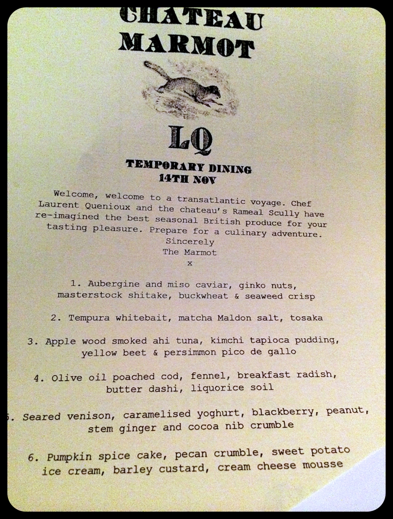 To eat the most exciting food at the best prices, sometimes a little tramping of the streets is required, down cobbled streets and through industrial archways. Thus we found ourselves in East London, on the hunt for a Marmot hidden behind a man with a clipboard under a violet street light. We knew it would be worth the trip after visiting their Leeds pop up and took along some friends for the tastebud ride. As you can see from the menu below, which we didn’t see ’til we arrived #topsecret, there were some unusual combinations and ingredients I hadn’t ever heard of before – tosaka anyone? That’s what I love about pop-ups, sheer indulgence and mostly for an excellent price, in this case under £50 for six courses. A treat yes, but one guaranteed to get you talking, get you inspired and get you taking a risk with your cooking!