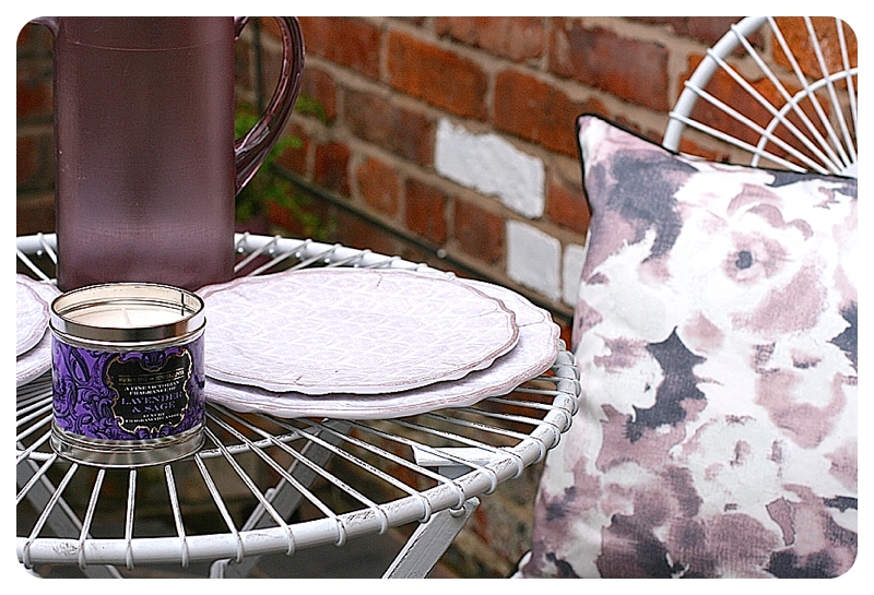 Everything worked perfectly together: the white ironwork table & chairs against the dark slate flooring, with cream and lavender plates, a tall drinks jug and scented candle; the pale green fretwork bird shelf which I personalised with a light dusting of nickel spray; the tall galvanised plant holder; the white windowed pillar candle holder; all created the fresh party look I wanted and made me a very happy designer.