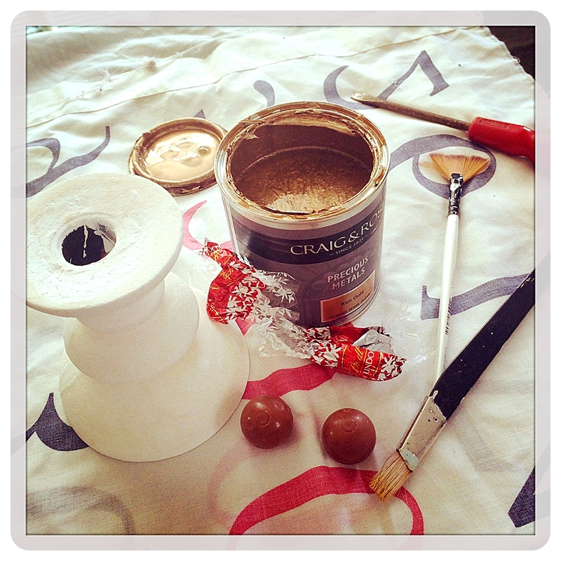 Sitting on my sofa scoffing Charlie’s Lindor chocolates (his fault for not hiding them don’t you think?), I decided I was bored with one of our candlesticks. An hour in the garden, a couple of coats of chalk paint, wax, light sanding and some Craig & Rose gold paint (a great buy at B&Q) gave it a whole new look. Now I re-love it 🙂