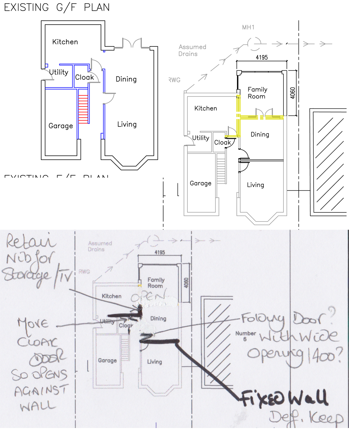 You can see the original layout top left. There is currently a large through living and dining with separate kitchen to the rear left. It’s amazing when you look at a house in this way how much ‘wasted’ space there is which isn’t lived in, e.g. here the garage, hallway, cloak and utility is about 40% of the ground floor.