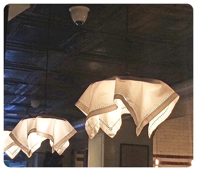 Capturing the whole industrial vibe rife at the moment, I liked it and suspect he was one of the first to go for a look which is now almost ubiquitous. Rough edged cream ceramic tiles, black and white geometric floor tiles and reclaimed timber tables create a relaxed atmosphere with tin tiles on the ceiling reflecting the teeny amount of light pooled from blown glass wall lights. My favourites were the napkin lights over the bar area, a clever and inexpensive twist on the original Ingo Maurer Delights. Apparently Norman likes the French phrase “jolie laide” which literally means pretty ugly, and this fits his ethos, the delicate fabric and glass provide prettiness in what’s a fairly dark and chipped away at interior. Very relaxed, we didn’t feel at all like we’d just stepped off a busy London street.