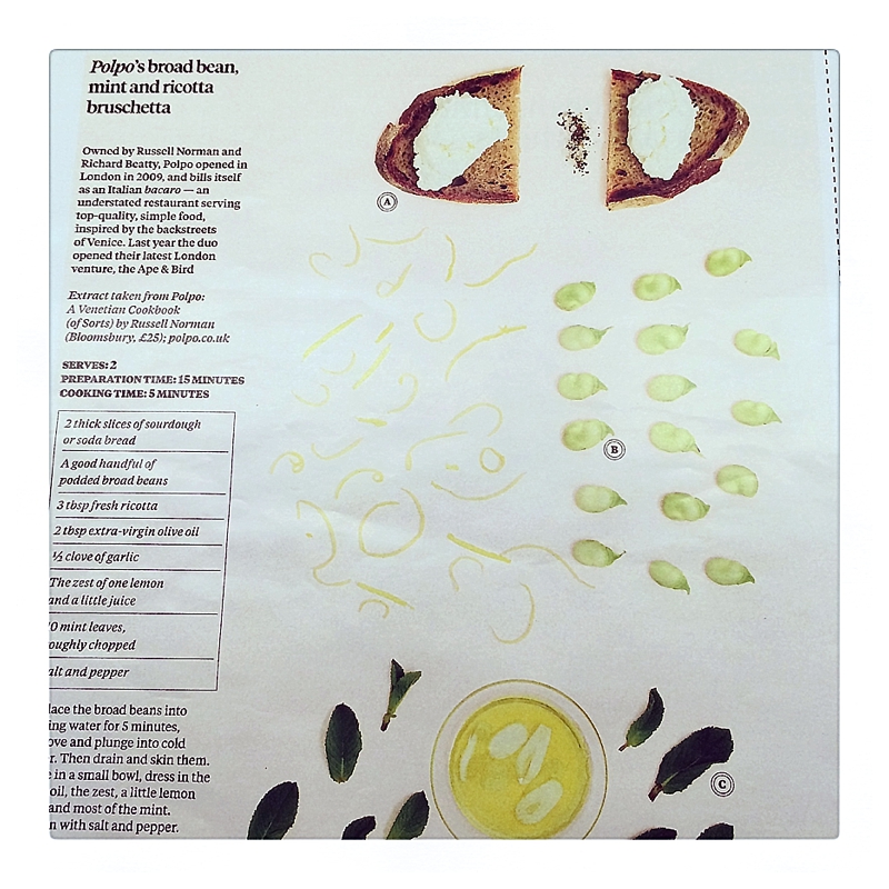 This is a beautiful, summery dish which we ate at Polpo last week, raved about, then lo & behold was featured in the Times magazine on Sunday – perfect timing! I thought I’d share it not only because it’s so invigorating to look at, but also because it’s delicious and a lovely thing to make on a sunny afternoon.