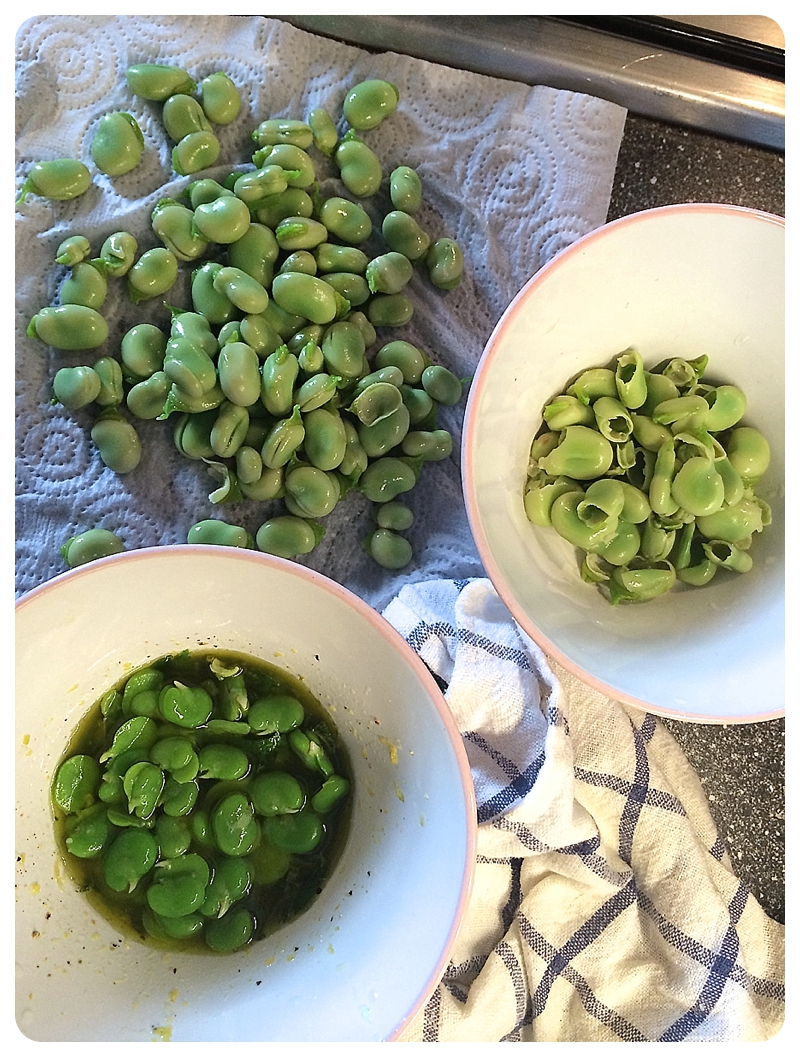 Blanch the broad beans in boiling water for 3 minutes, remove and plunge into cold water. Then drain and skin them. Place in a small bowl and dress them in the olive oil, lemon zest, a little lemon juice, most of the mint, salt and pepper.