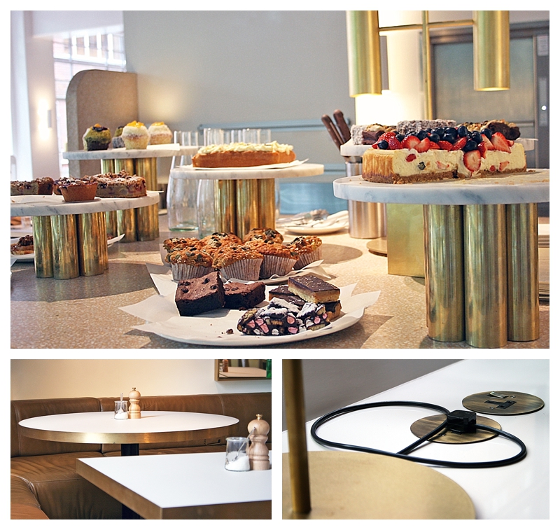 The use of large mirrors, high timber clad ceilings and pale wicker work chairs gives the place very non-British vibe, though the use of brass detailing on stairs, table edges, sockets and around the fabulous cake stand ground the scheme and make it feel solid somehow. The light streaming in through the windows bounces from the gold edging beautifully. What do you think of the brass risers & bannister on the stairs below – I adored them! Warm metallics are everywhere in 2014 but it’s clear Granger’s were well ahead of the curve on this trend.