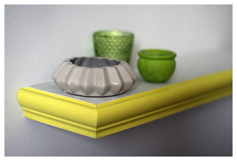 As we’d fitted picture rail in the room, I asked him to create shelves exactly the width and length I wanted, then edge them with the left over picture rail to perfectly match the rail detailing above. After a little filling, sanding and some undercoat, I chose a combination of the Yellowcake from our funky rocking chair and the Ammonite of the walls. Rather than buy extra Ammonite eggshell, I used the wall paint which was left over and then top coated with varnish I already had, saving some pennies, bonus! We fixed batons painted with Ammonite to the walls, then sat the shelving on top and screwed them in place, so the fixing are invisible. Neat eh?