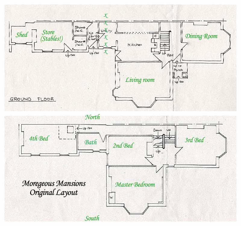 The phrase Original Layout is a bit of a misnomer, because I’m told the West facing section wasn’t originally attached to the house, but rather was a stables block later attached to the main house by the bit where the crosses are on the ground floor. This is now a utility area housing our kitchen sink minus hot water and fridge, and the erroneously named ‘Bath’ is upstairs, i.e. no bath since 2011!