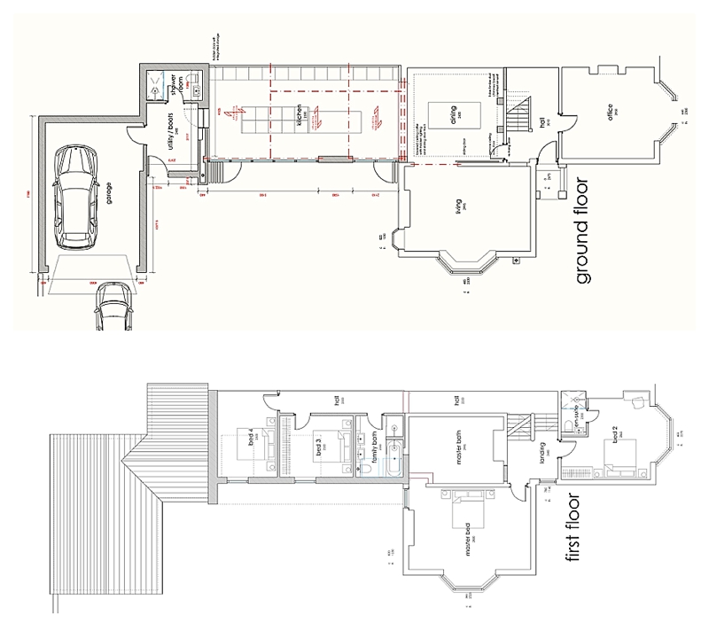 The West Wing : Some of you rightly guessed from the challenge of looking at the old plans that the original West Wing is now going to be transformed into a fabulous garden- and south facing kitchen with sliding doors and a contemporary feel to the interior, accessed by a full length opening from the old kitchen area / new dining room. The whole front elevation of this part of the property is jumping forward by about a metre and a half, allowing two bedrooms to be formed from the original one on the first floor. A much improved family bathroom will also be created on the first floor, as well as a separate utility on the ground floor and a large garage / work space. I’m so excited about this new kitchen having lived with a completely rubbish one for 8yrs and you know how much I love my cooking. I can’t wait!!