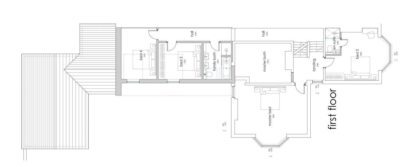 The East Side: To the right on the plans below is the east facing part of the house which had the original dining room on the ground floor and a bedroom above. Not a lot is changing here in the sense of square meterage, though full refurb is still required electrics, heating, plastering and window replacement. The ground floor will be my office (well spotted Andrea 😉 ) and on the first floor a guest bedroom, where we will be living for the duration of the build. We’re putting an en-suite in this room, which has been a bit of a challenge but totally necessary otherwise we’d be very stinky after a four month renovation.